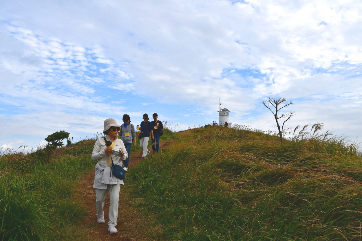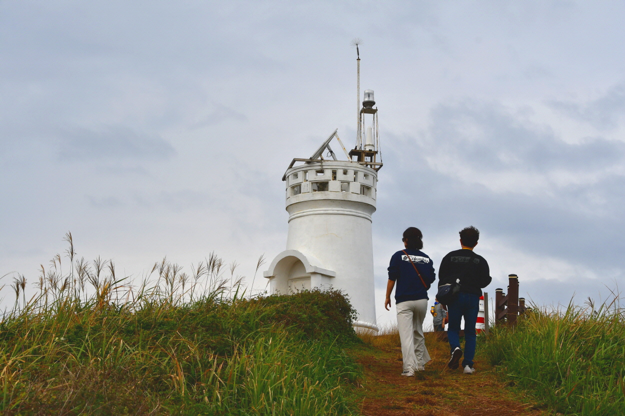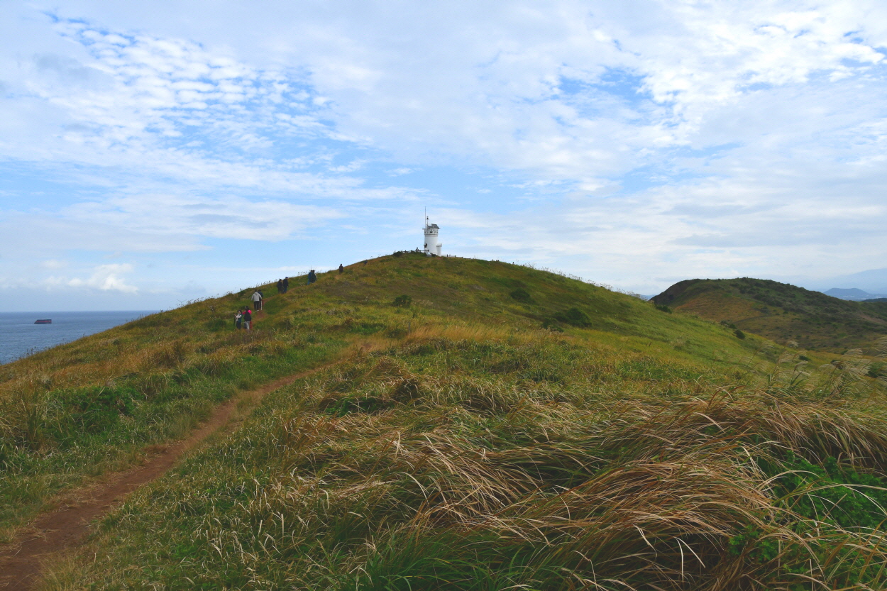 억새가 하늘 거리고 산 비탈 위로 하얀 등대가 보인다.