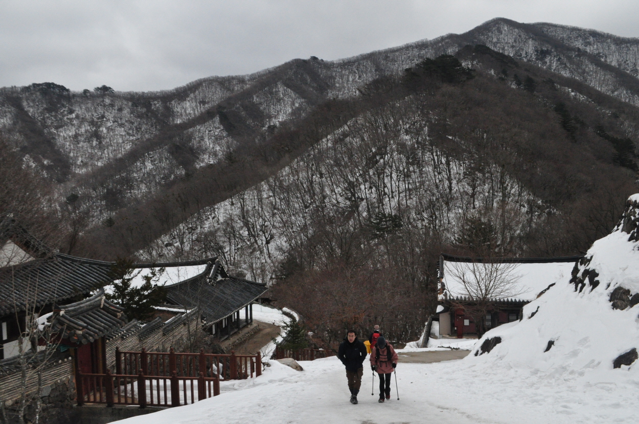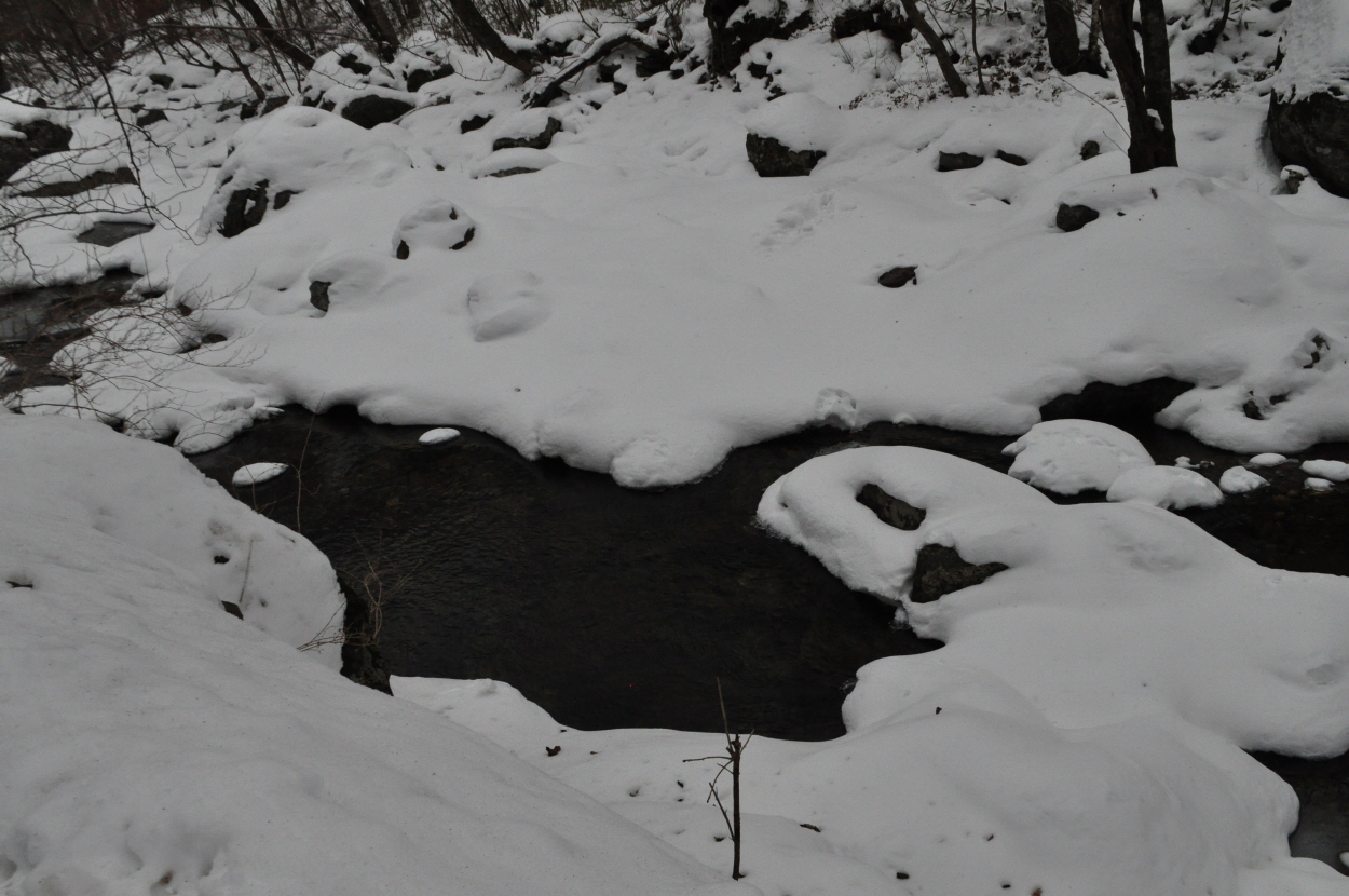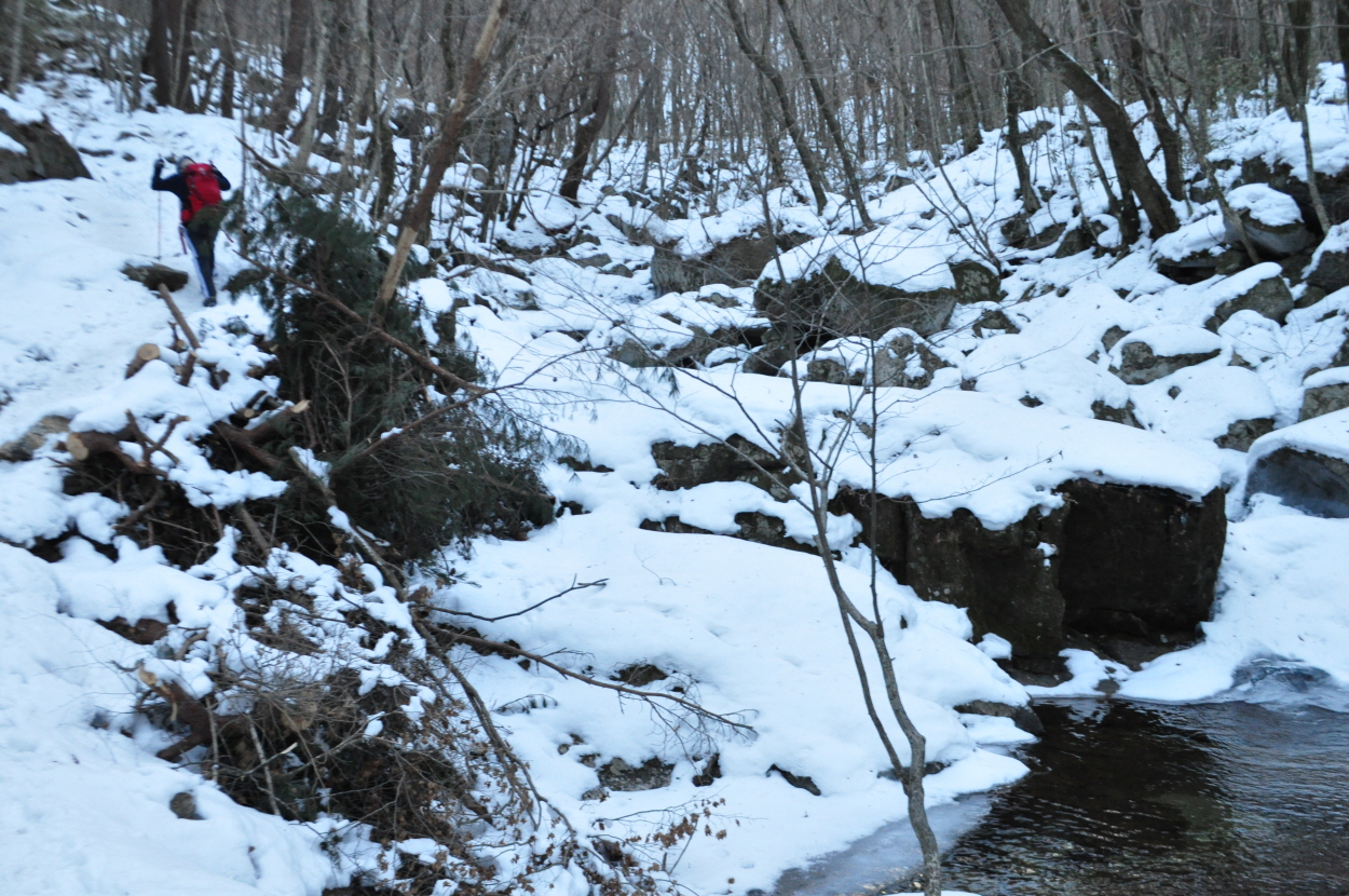 지루한 길이지만 눈덮힌 계곡의 풍경을 감상하며 여유롭게 내려가는 길이고 원기가